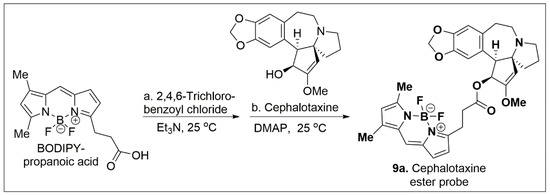 Fluorescent labels are generally used in bio-orthogonal labelling for co-localization studies in order to better understand the compounds’ mode of action [36]. Small-molecule fluorophores are the dominant method of choice due to their relative ease of use and excellent sensitivity, together with good spatial and temporal resolution. Washout studies of the corresponding BODIPY-FL ester have reliably shown that the reagent does not accumulate in the cell. Thus, 3-BODIPY-FL was treated with 2,4,6-trichlorobenzoyl chloride and Et3N for 1 h in DCM, followed by addition of cephalotaxine along with DMAP in DCM for 16 h RT to provide probe 9a in 87% overall yield as shown in Scheme 1 (Supplementary Material, Figures S11–S14).