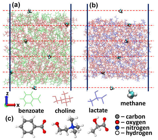 (a,b) Slabs of choline-benzoate (a) and choline-lactate (b) ionic liquids with embedded CH molecules. (c) Optimized structures of benzoate, choline and lactate molecules.
