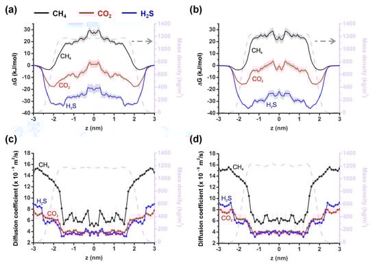 Figure 2c,d show the diffusion coefficients of the considered molecules at various z positions, calculated with Equation (2), for the [CH][BE] (c) and [CH][LAC] (d) systems. It is again clear from these figures that the diffusion patterns of CO (red curves) and HS (blue curves) molecules are similar. The highest diffusion coefficients are found at the interface, where the density of the ILs is the lowest, and smaller diffusion coefficients deeper inside the ILs, where the density becomes larger. The diffusion rate drops by more than a factor 2 when the molecule penetrates the systems. In both systems, the diffusion coefficient of CH is considerably larger than for the other two molecules, both at the interface and in the bulk (see black curves in Figure 2c,d). This indicates a smaller effective permeability of CH. In addition, diffusion rate of methane drops more sharply when the molecule penetrates the ILs. The variations of the z-dependent diffusion coefficient is also larger in the case of CH.