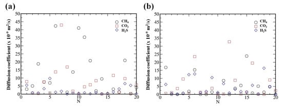 It is well known that ILs are often characterized by very high viscosity due to, e.g., strong coulombic interactions. Therefore, much longer simulations times (in ns range) are required to reach the dynamic equilibrium in the system and to estimate the diffusion coefficients [53,54]. In order to reach the equilibrium in the considered systems, we further performed 50 ns MD simulations for single solute molecule randomly placed inside the ILs. Even such long simulations result in considerably fluctuations of the diffusion coefficients (see Figure 3). Therefore, in order to better estimate diffusion coefficient of the considered solutes in the bulk of the ILs, we have conducted statistical averaging over different initial configurations. For that purpose we have placed a single gas molecule in 20 different positions randomly inside the bulk. This will improve the statistics of determining the diffusion coefficients. To avoid artificial problems in the calculations due to the overlap between the atoms, we have used large enough intermolecular distance during the generation of the gas molecules using Packmol. In addition, we have conducted structural optimizations for every random generation of the gas molecules inside the system followed by NPT simulations for the relaxation of lattice parameters of the simulation box before running long NVT simulations with periodic boundary conditions. The averaged diffusion coefficients (calculated from the mean square displacements) for CH, CO and HS molecules are 11.71, 6.57 and 2.21 ( m/s), respectively, inside the [CH][BE] IL. For [CH][LAC] system we obtained the average values 4.66, 6.09 and 4.72 ( m/s), respectively for CH, CO and HS gas molecules. These values are in good agreements with the ones obtained in US simulations (see Figure 2c,d).