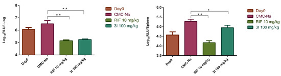 The in vivo efficacy of compound 3l was evaluated in a mouse model infected with autoluminescent Mtb H37Ra. The compound 3l was administered orally (100 mg/kg/day). The untreated control group was administered with sodium carboxymethyl cellulose (CMC-Na) solution. Rifampicin was used as the positive control. After five days treatment, the burdens of the bacteria in lungs and spleens of the mice were determined by the bioluminescence intensity detection. The results are summarized in Figure 1. A significant reduction (1.3 log) of relative light unit (RLU) in the lung was achieved compared with the untreated control group. A small reduction of RLU (0.4 log) was observed in the spleen.
