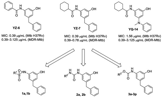 In the previous study, we found that m-amidophenol derivatives YZ-6 and YZ-7 showed potent in vitro inhibitory activity against Mtb H37Ra, H37Rv and clinically isolated MDR-Mtb strains (MIC = 0.39–3.125 μg/mL) (Scheme 1) [14,15]. However, the two compounds did not exert in vivo efficacy on a mouse infection model. Recently, we designed and synthesized a series of new m-amidophenol derivatives with 5-heteroatomic substitutents (OR, SR, NRR′) [16]. One privileged compound YQ-14 showed potent in vitro antitubercular activity and weak in vivo efficacy (Scheme 1). Because the clearance rates of YZ-6 and YQ-14 in mouse liver microsome were high (T1/2 = 6.60 and 5.43 min, respectively), further structural modifications to improve the metabolic stability and in vivo potency are desirable. We designed and synthesized new derivatives of YZ-6 and YZ-7 via the replacement of 1-amido group with sulfamide, urea and carbamate moieties. Such replacements were expected to provide a higher metabolic stability towards enzymatic hydrolysis. In addition, binding with the target may be enhanced considering the introduction of more oxygen and nitrogen atoms. Among the new derivatives, 3-hydroxylphenylcarbamates were found to exhibit potent in vitro and in vivo antitubercular efficacy. The results are reported in this paper.