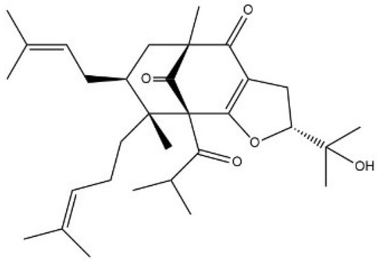 Using time of flight mass spectrometry (TOF-MS) in the positive ion mode, we determined that the compound isolated from H. scabrum had a molecular formula of C31H46O5 ([M + H]+ ion at m/z 499.3414, corresponding to C31H47O5). The structure (Figure 1) was assigned using nuclear magnetic resonance (NMR) (Figure S1 and Table S1) and high-resolution mass spectrometry (Figure S2). We identified the compound as a PPAP based on our analysis of 1D and 2D-NMR results, having a furan ring, two isoprenyl groups, tertiary and quaternary methyl, and three carbonyl groups connected to different parts of the structure, which are the key features of this class of compounds. The comparison of NMR chemical shifts and MS data with reported values and known compounds in the literature confirmed our compound as hypermongone C [30]. The heteronuclear single quantum coherence (HSQC) and heteronuclear multiple bond correlation (HMBC) correlations established the bicyclic structure (Figure S1).