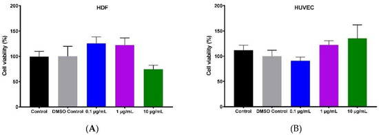 In order to determine cell viability, HUVECs and HDFs were cultured in their growth media to reach 80% confluency. Cells were seeded at a density of 5 × 103 cell per 96 well plates in a total volume of 100 µL in each well. After seeding, the cells were incubated for 24 h at 37 °C and 5% CO2 to allow for cell attachment. Media supplemented with the different concentrations of hypermongone C (0.1, 1, and 10 µg/mL) was replaced. The compound was first dissolved at a concentration of 10 mg/mL in DMSO and subsequently diluted in culture media. Following 24 h incubation, media containing 20% MTS solution was replaced with growth media and incubated for 2 h. The absorbance of each well at 490 nm was measured using a Spectramax 190 spectrometer (Sunnyvale, CA, USA).