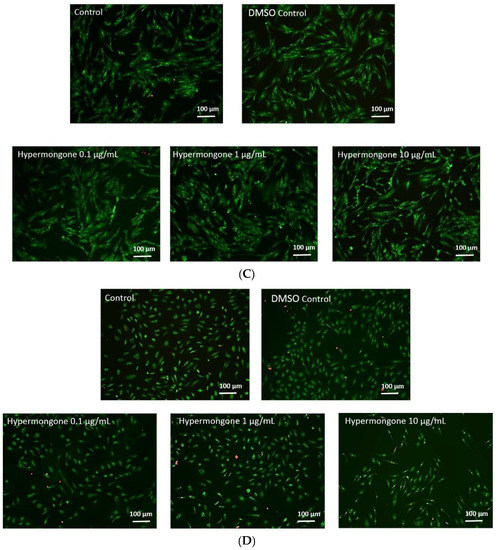 Concentration-dependent cell proliferation of (A) human dermal fibroblasts (HDFs) in response to various concentrations of hypermongone C after 24-h exposure, calculated using the MTS assay. No toxicity was observed in the range of 0.1 and 1 µg/mL when compared to the control (untreated cells in growth media). (B) The percentage viability of human umbilical vein endothelial cells (HUVECs) in response to 8-h incubation with various concentrations of hypermongone C did not show toxicity by the MTS assay. (C) The LIVE/DEAD® assay of HDFs and (D) HUVECs confirmed the non-toxic effect of hypermongone C on the cells.