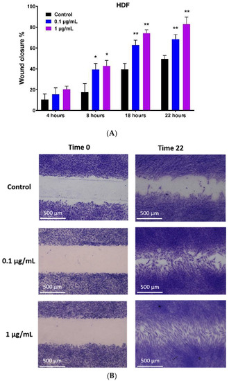 Migration assay of hypermongone C. (A) Wound closure percentage of HDFs after different time intervals of exposure to different concentrations of hypermongone C. The compound at a concentration of 1 µg/mL demonstrated the highest migration over 22 h. Multiple t-tests were performed using Graph-Pad Prism 7.03 to determine the significance between each experimental group and control (* p ≤ 0.05 and ** p ≤ 0.01). (B) Representative images of each treatment group after 22 h.