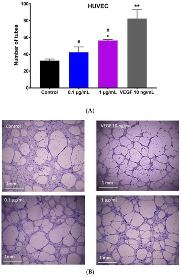 - DeCicco-Skinner, K.L.; Henry, G.H.; Cataisson, C.; Tabib, T.; Gwilliam, J.C.; Watson, N.J.; Bulwinkle, E.M.; Falkenburg, L.; O’Neil, R.C.; Morin, A.; Wiest, J.S. Endothelial cell tube formation assay for the in vitro study of angiogenesis. J. Vis. Exp. 2014, e51312. [Google Scholar] [CrossRef]