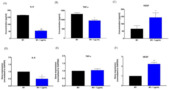 The influence of hypermongone C on cytokine expression in culture media was determined for (A) interleukin (IL)-6, (B) tumor necrosis factor (TNF)-α, and (C) vascular endothelial growth factor (VEGF) by enzyme-linked immunosorbent assay (ELISA) assay. Gene expression of (D) IL-6, (E) TNF-α, and (F) VEGF by M1 macrophages was determined after 24 h treatment hypermongone C using quantitative real-time PCR. Gene expression was normalized to the housekeeping gene GAPDH (internal control) and the control group (non-treated M1 macrophages (2−ΔΔC)). * p ≤ 0.05 and ** p ≤ 0.01 as compared to the control group.