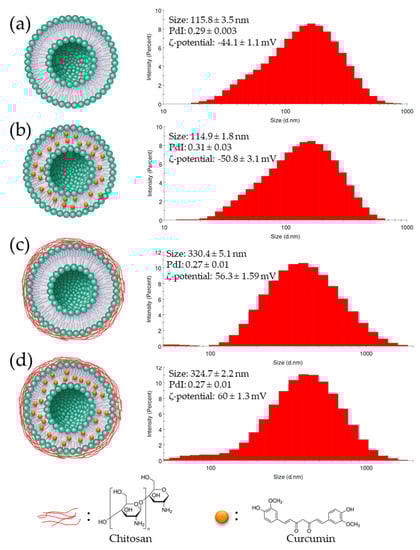 Schematic and physicochemical characterization of (a) nanoliposomes, (b) curcumin-loaded nanoliposomes, (c) chitosan-coated nanoliposomes, and (d) curcumin-loaded nanoliposomes coated with chitosan.
