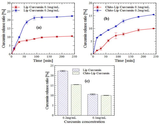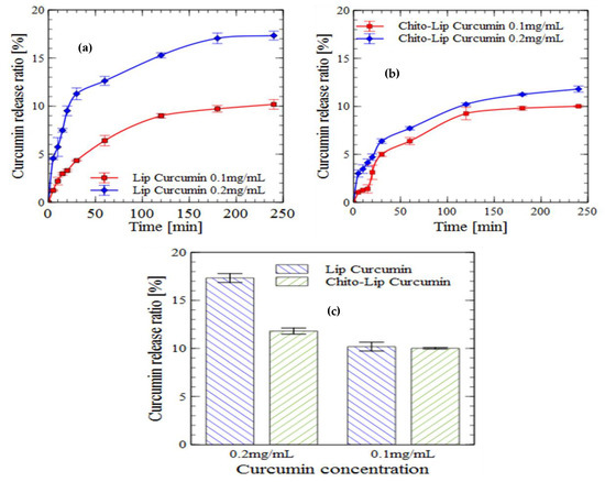 The curcumin release rate from all nanoliposome formulations was higher in the simulated intestinal fluid than in the simulated gastric fluid. Moreover, the release was much lower when the chitosan coating was applied, which might be due to the fact that polysaccharides have the capacity to inhibit lipid digestion [67,68].