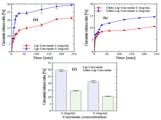 Curcumin encapsulated in uncoated and chitosan-coated nanoliposomes was incubated at 37 °C in PBS, and it’s in vitro release behavior was studied over four hours and is presented as a cumulative release percentage in Figure 2. A biphasic release profile was observed for all formulations. A biphasic release profile is composed of an immediate drug release followed by a sustained release [54]. The biphasic delivery system helps in overcoming multiple dosing regimen problems [55].