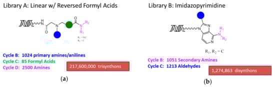 Libraries A and B were synthesized by a split and pool procedure in which both a chemical step and a DNA tagging step occurred in each split. The general procedures for DNA-encoded library synthesis have been described before [,,,,,,,]. Library A was a 3-cycle library, and its synthesis was initiated with the installation of bromoacetic acid onto the linker. Then the material was split into 1024 wells. The first cycle (B) was performed by the installation of 1024 primary amines or anilines using SN2. Each split of cycle B was tagged with 1 of 1024 unique oligonucleotides and pooled. Then the library was split into 85 wells, into each of which 1 of 85 formyl acids was installed by reductive alkylation (cycle C). Each split of cycle B was tagged with 1 of 85 unique oligonucleotides and pooled. Finally, the library was split again to install 2500 amines by acylation (cycle D). Each split of cycle D was tagged with one of 2500 unique oligonucleotides and pooled. Library A totaled 217.6 million linear molecules (Figure 1a). Library B had 1.3 million individual compounds and was comprised of two diversity steps displayed on an imidazopyrimidine core (Figure 1b). Synthesis was initiated with a nitro-chloro-pyridine core, to which 1051 secondary amines were installed by SNAr at cycle B. The material was pooled, and the nitro group was reduced. At the following cycle, 1213 aldehydes were installed by using oxidative cyclization. The library was tagged in a similar fashion to Library A. Library B totaled 1,274,863 individual compounds. Each step of library synthesis was monitored by LCMS, and each library was HPLC-purified on a Gilson HPLC (Middletown, WI, USA) after each split and pool cycle.