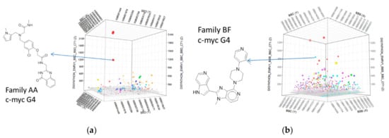3D scatter plots showing individual enriched features against the c-myc G4 oligonucleotide. These were used to inform the design of compounds for resynthesized without DNA attached. (a) Library A, with Family AA in red; (b) Library B, with Family BF in cerulean blue. Arrows indicate which of the enriched features represent the resynthesized active compounds. The x and y axes represent individual building blocks at the indicated cycles of synthesis. The z axis represents a statistical metric of enrichment significance (ENRv1) for each disynthon (negative log10 of the asymptotic significance value).