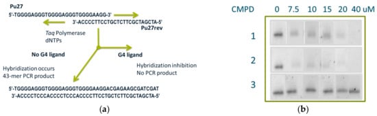 The stabilization of G-quartet structures by specific ligands was investigated by a PCR-stop assay [,] using a test oligonucleotide and a complementary oligonucleotide that partially hybridizes to the last G-repeat of the test oligonucleotide. Sequences of the test oligonucleotides (Pu27 c-myc G4) and the corresponding complementary sequence (Pu27rev) used here are presented in Figure 4. Assay reactions were performed in a final volume of 25 µL in Platinum Supermix (ThermoFisher) supplemented with 50 mM of KCl: 0.5 uM of each of the two oligonucleotides and the indicated amount of the ligand. Reaction mixtures were incubated in a thermocycler with the following cycling conditions: 94 °C for 2 min, followed by 30 cycles of 94 °C for 30 s, 58 °C for 30 s, and 72 °C for 30 s. Amplified products were resolved on 4% agarose gels (Invitrogen) stained with ethidium bromide. The gels were analyzed on an Alpha Innotech system using transillumination.