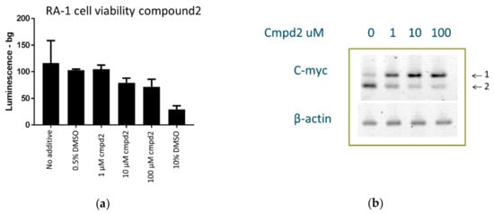 Viability of RA 1 cells (Burkitt’s lymphoma, dependent on c-myc): (a) 48-h cell viability in the presence of different concentrations of Compound 2 as determined by Cell Titer-Glo assay (Promega); (b) RT-PCR of c-myc expression in RA 1 cells after 24 h of treatment with different concentrations of Compound 2. Here, 1: Full-length PCR product; 2: Primer-dimer. Full gels are presented in Figure S6.