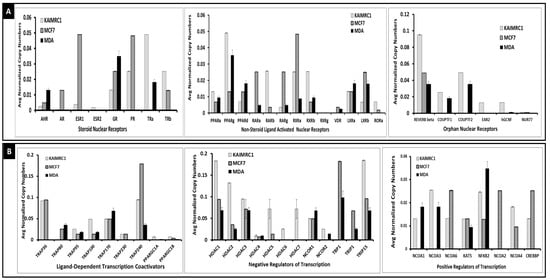 Nuclear receptors and their cofactors expression: The expression of the nuclear receptors (A) and their cofactors (B) were assessed in KAIMRC1, MCF7 and MDA-231 cells using the Qiagen RT² Profiler™ PCR Array Human Nuclear Receptors and Coregulators. The expression of steroid-thyroid, non-steroid/thyroid and orphan nuclear receptors as well as ligand activated cofactors, positive and negative regulators of transcription are plotted as an average of three independent experiments.