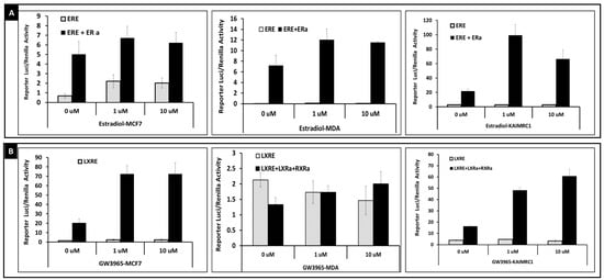 Nuclear receptors activity in KAMRC1, MCF7 and MDA-231: KAIMC1, MCF7 and MDA-231 cells were transfected with the following plasmids (A) ERE-3-Luciferase (pXP-ERE-3-luc) and pSG5-HEG0 (ERa) and treated with estradiol (B) LXRE-Luficerase reporter and pcDNA 3.2 LXR alpha) (C) PPARE(3)-tk-Luciferase plasmid, pcDNA3.1-Human PPARa, pcDNA3.1-hRXR alpha and treated with PPARalpha specific ligand GW7647 (D) PPARE(3)-tk-Luciferase plasmid, pSG5-hPPARgamma, pcDNA3.1-hRXR alpha and treated with PPARgamma ligand rosiglitazone (E) RARE-tk-luciferase, pSG5-hRARalpha, pcDNA3.1-hRXR alpha and treated with retinoic acid (F) RXRE (D1)-tk-luciferase, pcDNA3.1-hRXR, pcDNA 3.2 LXR alpha and treated with Bexarotene or RXR compound (RXRc) (G) VDRE-Luciferase plasmid, pSG5-hVDR, pcDNA3.1-hRXR and treated with Vitamin D3. 0.5 μg of pRL-CMV renilla was included in all the transfection, and compounds treatment were at 0, 1 and 10 μM. The reporter activity was calculated based luciferase activity/renilla activity.