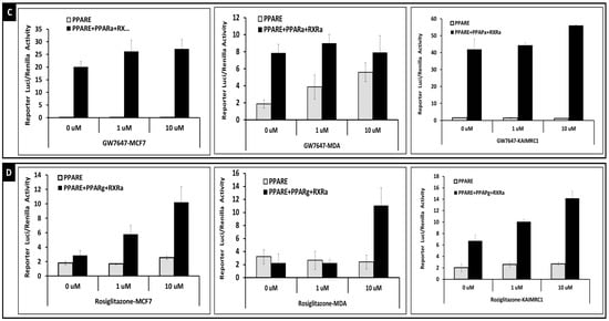 The transcription activity of PPARa is shown in Figure 2C. In KAIMRC1 and MCF7 cells, the activation of PPARE(3)-tk-Luciferase reporter is dependent on the co-expression of exogeneous PPARa/RXRa, while in MDA-MB231, the reporter seems to be constitutively active, and it is responsive to the PPAR alpha ligand, GW7647. Co-expression of exogeneous PPARa/RXRa increased the reporter activity in all three cell lines. GW7647 treatment of cell overexpressing PPARa/RXRa did not induce any further the stimulation. The three cell lines showed a similar basal transcriptional activity of PPARg. Moreover, and in the absence of exogenous expression of PPARg/RXRa, all three cell lines were insensitive to the PPARE ligand, Rosiglitazone. Co-expression of exogenous PPARg/RXRa induces PPARE reporter further and the activation was boosted when cells were treated with the PPARg specific ligand, rosiglitazone. KAIMRC1 and MCF7 showed similar and higher sensitivity to rosiglitazone than MDA-MB231 cells. Based on these results, KAIMRC1 showed a closer behavior to MCF7 cell line than MDA-MB231.