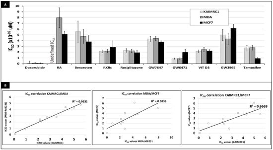 Cytotoxic effect of nuclear-receptor ligands (NRLs) on MDA-MB231, MCF7 and KAIMRC1 cell lines. IC50 values, showing the growth inhibitory effect of the different nuclear receptors on MDA-MB231, MCF7 and KAIMRC1 cell lines are represented in (A). IC50 values were used to make a comparative analysis of the sensitivity of the three cell lines to NRL-cytotoxicity. Effect-correlations are represented in (B).