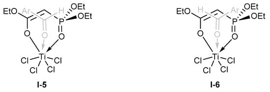 The complete regioselectivity of the reaction in the presence of titanium tetrachloride (Method B) or adsorbents was explained by a chelate-complex formation, Figure 3, involving 4 and the titanium salt. An analogous orientation of the reactants on the surface of the adsorbent might also be assembled in that case. Due to the strong steric effect between the phosphoryl and the aromatic group, the formation of intermediate I-5 was favored and since this steric interaction could appear in the first step of the process, it could prevent the formation of I-6. Therefore, the reaction took place as a preferential stereoselective E-olefination.