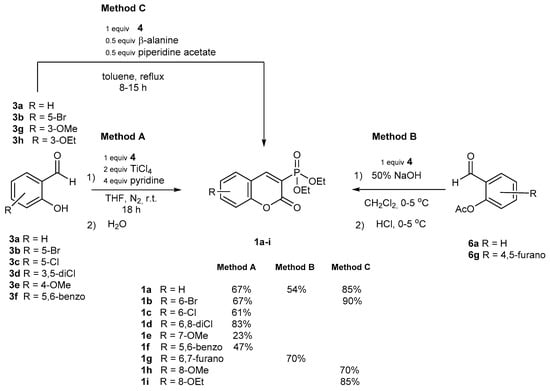 Falsone et al. [19] applied piperidine acetate/β-alanine as catalyst for the initiation of the lactonization process. The reaction between substituted salicylaldehydes 3a–b, 3g–h and triethyl phosphonoacetate (4, Scheme 2, Method C) resulted in the formation of 3-diethylphosphono- coumarins 1a,b and 1h,i in high yields. The applied catalyst demonstrated excellent activity in the Knoevenagel condensation in comparison with the other catalytic systems used in Method A and Method B.