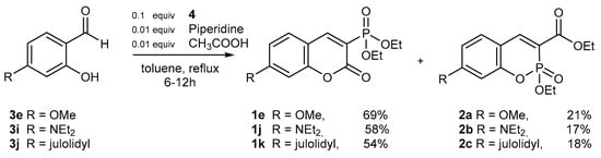 Chen and coauthors [17] were the first to report the formation of alkyl 1,2-benzoxa- phosphorin-3-carboxylates 2 via Knoevenagel condensation. The reaction of triethyl phosphonoacetate (4) and electron-donating group-substituted salicylaldehydes 3e and 3i,j was catalyzed by freshly prepared piperidinium acetate. Thus, not only the corresponding 3-diethylphosphonocoumarins 1e and 1h,i were isolated and characterized, but also their analogues 2a–c in which a P-atom replaced the α-pyronyl carbon atom (Scheme 3). In Section 3. of the article the specific methods for the synthesis of 1,2-benzoxaphosphorines and their derivatives are discussed.