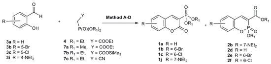 In 1985 Singh and Rogers [16] reported a modified procedure for the synthesis of substituted 3-diethylphosphonocoumarins by using triethyl phosphonoacetate (4) and series of salicylaldehydes 3a–f (Scheme 2, Method A). The reaction was accomplished in 18 h using titanium tetrachloride/pyridine as a catalytic system and tetrahydrofuran as a solvent. The structures of isolated 3-dialkylphosphonocoumarins 1a–f were characterized for the first time by 31P-NMR spectra and for 1b by 1H-NMR.
