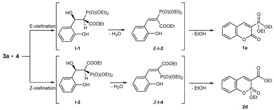 The observed regioselectivity is explained on the base of the configuration of the two possible intermediates I-1 and I-3 (Scheme 5) which are formed in the addition step. Subsequent trans-elimination of a water molecule leads to formation of intermediates E-I-2 and Z-I-4. The following intermolecular pre-esterification of the phosphoryl or ester group resulted in ring closure to the corresponding 3-diethylphosphonocoumarines or 1,2-benzoxaphosphorines. The preferred E-configuration of the intermediate E-I-2 was due to the strong steric interaction between the bulky phosphoryl group and the hydroxyphenyl substituent that could be observed in the intermediate I-3. The predominant isolation of 3-diethylphosphonocoumarines over 1,2-benzoxaphosphorines is a result of the formation of the stable E-isomer in that reaction conditions.