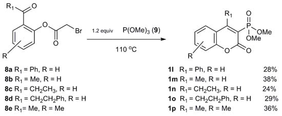 During the investigations of the synthesis of new therapeutics, Budzisz et al. performed a reaction of 2′-bromoacetoxyphenones 8a–e with trimethyl phosphite (9, Scheme 6) and coumarin compounds were isolated as minor products [21]. The authors elaborated on the formation of Arbuzov type CH-acidic compounds that proceeded in an intramolecular Knoevenagel condensation resulting in the formation of 1l–p.