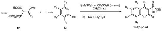 Another approach for the synthesis of the target 3-diethylphosphonocoumarins 1 was applied by Janecki and coworkers [23,24,25,26,27], using strong acids as catalysts for Friedel-Crafts alkylation of differently substituted phenols followed by spontaneous lactonization (Scheme 8).