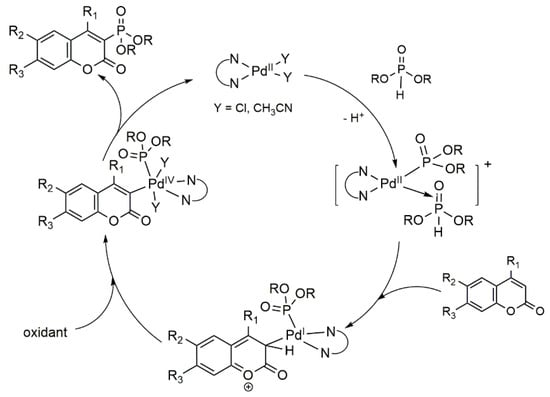 The optimized conditions for the selective phosphorylation of coumarins 14 included a combination of catalysts—Pd-bearing component and Ag(I) salts—thus, the highest yields were reported. Substituents at C-7 or C-4 in the benzopyran system favored the phosphorylation reaction (86–89%), though substituents at position C-6, either electron-withdrawing (41%) or electron-donating groups (36%), resulted in lower yields. The results for the coumarin 1a remained higher using di-iso-propyl (70%) and dimethyl (68%) H-phosphonates than other dialkyl phosphonates (R = Et 64%; R = n-Bu 44%; R = i-Bu 46%; R = n-Pr 46%; R = n-pentyl 52%).