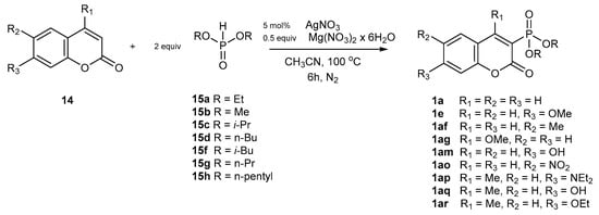 An efficient regioselective silver-catalyzed direct Csp2-H radical phosphorylation of coumarins was presented by Mao et al. [31]. Phosphorus-containing compounds 1a, 1e, 1af–ag, 1am–ar were prepared in a reaction of coumarins 14 with different dialkyl H-phosphonates 15a–d, 15f–h under mild reaction conditions in the presence of catalyst AgNO3/Mg(NO3)2 × 6H2O (Scheme 12). The metal-promoted synthetic protocol derived the expected products 1 with moderate to good yields (45–65%).