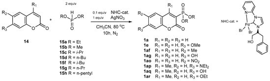 A year later, Mao et al. reported [32] a modified selective protocol for the phosphorylation of coumarins using N-heterocyclic carbene palladium complexes. The catalytic activity of different NHC-complexes was implied in the reaction. The complex presented in Scheme 14 showed the best catalytic efficiency in the phosphorylation reaction. A wide range of dialkyl H-phosphonates 15a–d, 15f–h reacted smoothly with coumarins 14 resulting in the complete regioselective synthesis of the target molecules 1a, 1e, 1af, 1am–ar in moderate to high yields.