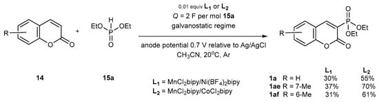 The preparation of 3-dialkylphosphonocoumarins through a direct phosphorylation of C-H bond of the aromatic system remains one of the used synthetic approaches that corresponds to the principals of green chemistry–atom economy, single step processes, low amounts of waste products, etc. Recent approaches for the synthesis of 3-dialkylphosphonocoumarins include electrochemical initiation of the phosphorylation. A new method for C-P bond formation at position C-3 in the benzopyran system was reported in 2016 by Khrizanforov et al. [33,34]. The synthetic protocol was based on an oxidation process of aromatic compounds 14 and diethyl phosphonate (15a) in the presence of bimetallic catalytic systems (Scheme 15). Two bimetallic systems as the pairs MnCl2bipy/Ni(BF4)2bipy and MnCl2bipy/CoCl2bipy were used where 2,2′-bipyridine was an additional ligand. The reaction took place at room temperature by applying equimolar ratio between the coumarin and the used phosphonate 15a. Coumarins, bearing electron-donating groups, gave better yields in phosphonation reactions in comparison with the unsubstituted benzopyran system (Scheme 15).