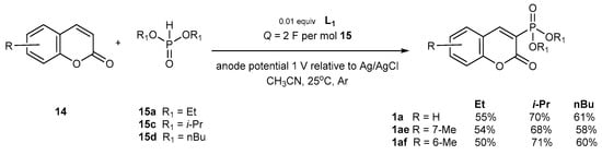 Subsequent investigations by Khrizanforov et al. [35] for the preparation of coumarin phosphonates in the presence of MnCl2bipy/Ni(BF4)2bipy showed changes in the electrochemical parameters by applying three dialkyl H-phosphonates (Scheme 16). In this study di-iso-propyl phosphonate resulted in yields of up to 70%. An interesting circumstance is that the yields were obtained after one-day reaction mixture storage before electrolysis, which was necessary for the formation of the metal phosphonate complex. Full conversion of the dialkyl H-phosphonate was observed under the described conditions.