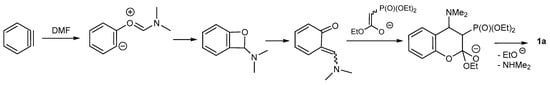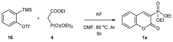 The reported protocol [36] represents a reaction between an in situ generated benzyne fragment (Scheme 18) and an active methylene compound bearing a diethylphosphoryl group in DMF at 80 °C. The compound 1a was produced in 74% yield (Scheme 17).