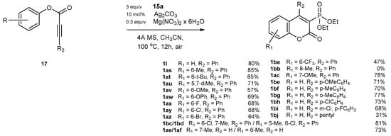 Currently several utilized methods of C-P bond construction as an electrophilic phosphorus reagent and transition-metal-catalyzed cross-coupling synthetic protocols for the formation of phosphorus-containing coumarin systems are listed. Another approach relied on a domino reaction via an intermolecular addition of P-centered radicals to alkynes followed by fast cyclization onto the aromatic π-system [37]. The tandem radical phosphorylation-cyclization reaction of readily prepared phenyl alkynoates 17 with diethyl H-phosphonate substrate 15a was investigated in the presence of combination of Ag2CO3, Mg(NO3)2x6H2O in CH3CN for 12 h to afford the corresponding 3-dialkylphosphonocoumarins 1l, 1as–bj (Scheme 19).