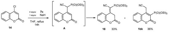 CH-acidic component as diethyl cyanomethylphosphonate (7c) was used in a reaction with some α- and β-monohalocarbonyl compounds [39]. As a result of nucleophilic aromatic substitution an intermediate A was formed from 4-chlorocoumarin (14) with 7c in the presence of an equimolar amount of NaH in THF, Scheme 22. Tautomerization to vinylphosphonate 18 or thermal rearrangement to the 3-diethylphosphonocoumarin 1bk were next steps in the intermediate A transformation.