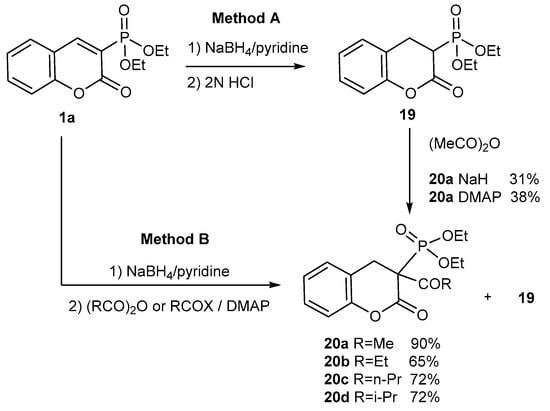 The chemical behavior of diethyl 2-oxo-2H-1-benzopyran-3-phosphonate (1a) in hydrogenation/acylation reactions under different conditions was studied [51] and high regioselectivity for the C-acylation product 20 was observed. Two reaction paths presented in Scheme 23 demonstrate the advantage of one-pot reactions versus the multistep routes. The first path shown as Method A involved deprotonation of 3,4-dihydroadduct 19 by NaH or DMAP and formation of enolate ion which reacted with anhydride to form the acylated product 20a. However, the yields were rather unsatisfactory, 31 or 38%. The second approach, Method B, presented a one-pot reaction with in situ generated enolate ion followed by its trapping with a series of anhydrides produced the expected products 20a–d in higher yields (Scheme 23).