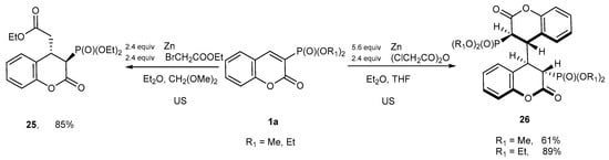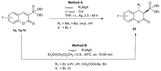 Fundamental research on the synthesis of compounds 25 was presented by Nikolova et al. [53]. In this study, ultrasonic waves were used as a promoter of the reaction—Method B, Scheme 25. The sonication method provides an unusual mechanism to generate high-energy chemistry due to the extraordinary temperatures and pressure generated by the collapse of cavitation bubbles, while it can accelerate organic reactions involving metal-mediated processes because of the metal surface activation and the particle size reduction, producing modified metal surfaces and at the same time speeding up the formation of organometallic reagents. The reaction between 3-diethylphosphonocoumarin 1a and the organomagnesium compound was completed as Michael-type addition and the formation of trans-isomers of products 25 were observed. Methods for initiating the reaction—thermal or ultrasonic, were further investigated and a relationship between the yields and the reaction time as well as the applied technique was indicated in Table 3.