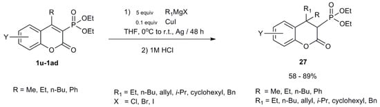 Applying 4-substituted 3-diethylphosphonocoumarins 1u–ad (Scheme 28), as Michael acceptors another approach toward the investigation of the regioselectivity of the reaction and the possibility for incorporation of a second alkyl substituent in δ-lactones 27 was presented [26,27]. The study was accomplished with a series of organomagnesium reagents (ethyl-, iso-propyl-, n-butyl-, cyclohexylmagnesium chlorides, allylmagnesium iodide and benzylmagnesium bromide) 4,4-disubstituted 3-diethoxyphosphoryl-3,4-dihydro-2H-chroman-2-ones 27 were isolated in moderate to good yields in a mixture of trans- and cis- isomers. Only in three cases the product was found to be a single trans-isomer.