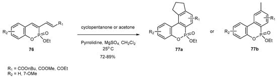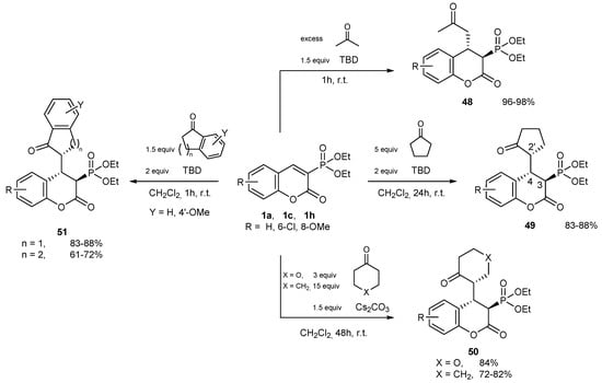 Phosphorylated azaheterocycles were synthesized [57] by three-component reaction between 3-diethylphosphonocoumarin 1a with acetone, cyclopentanone or cyclohexanone and benzylamine. These compounds are promising precursors for the preparation of polycyclic δ-lactams possessing potential biological activity.