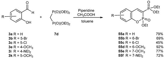 Few years later another approach presented the synthesis of 3-diethylphosphonocoumarines and 1,2-benzoxaphosphorines applying various CH-acidic components. Bojilova et al. [20] performed the Knoevenagel reaction under modified conditions using both organic and inorganic catalysts (Table 1, Scheme 4). The main contribution of the study was the analysis of the ratio between the two chemoisomers and the possible mechanism of the reaction.