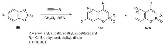 - Nemtarev, A.V.; Mironov, V.F.; Varaksina, E.N.; Gubaidullin, A.T.; Krivolapov, D.B.; Musin, R.Z.; Litvinov, I.A. Reaction of arylenedioxytrihalophosphoranes with acetylenes 12. Alkylacetylenes in the reaction with 2,2,2-trihalobenzo-1,3,2-dioxaphospholes. Russ. Chem. Bull. 2014, 63, 149–177. [Google Scholar] [CrossRef]