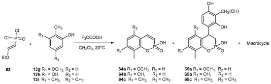 - Sadykova, Y.M.; Sadikova, L.M.; Badrtdinova, A.R.; Dobrynin, A.B.; Burilov, A.R.; Pudovik, M.A. Condensation of 2-Ethoxyvinylphosphonic Acid Dichloroanhydride with 2,3,5-Trimethylphenol. Novel Method for Preparation of Phosphacoumarins. Phosphorus Sulfur Silicon 2015, 190, 2267–2272. [Google Scholar] [CrossRef]