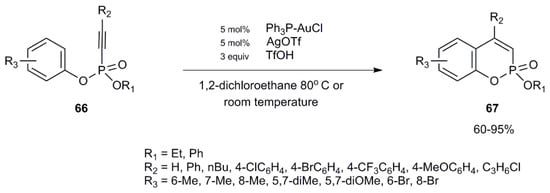 - Kim, C.-E.; Ryu, T.; Kim, S.; Lee, K.; Lee, C.-H.; Lee, P.H. Gold-Catalyzed Hydroarylation of Aryl Alkynylphosphonates for the Synthesis of Phosphacoumarins. Adv. Synth. Catal. 2013, 355, 2873–2883. [Google Scholar] [CrossRef]