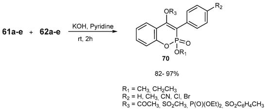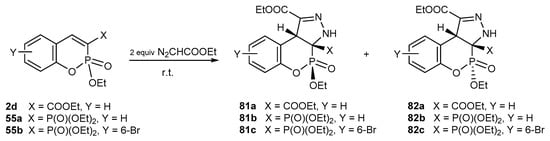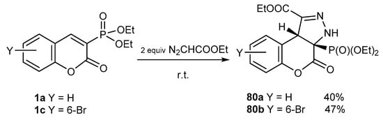 Pyrazoline derivatives of 3-diethylphosphonocoumarin 80a,b, 1,2-benzoxa- phosphorine-3-carboxylates and 1,2-benzoxaphosphorin-3-phosphonates 81 were prepared [64] in reactions with ethyl diazoacetate. The solvent mixture for the three coumarins was different based on their solubility and the solubility of the products. Benzene and chloroform were preferred as solvents in the case of coumarins 1a and 1c and pyrazolines 80a,b were isolated in moderate yields (Scheme 51).