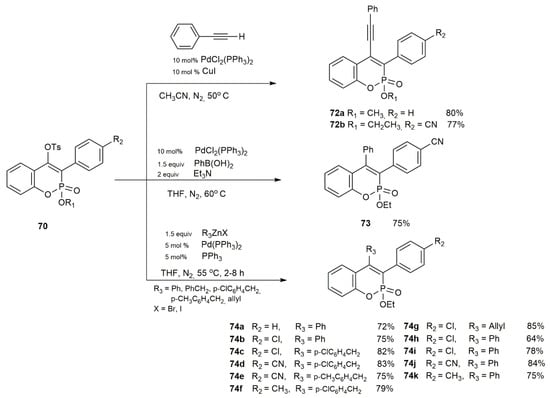 - Li, X.; Shen, F.; Fu, H.; Jiang, Y.; Zhao, Y. Synthesis of 4-Substituted Phosphacoumarins via Cross-Coupling of 4-Tosylphosphacoumarins with Organozinc Reagents. Synlett 2006, 4, 630–632. [Google Scholar] [CrossRef]
