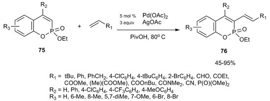 - Kim, C.-E.; Son, J.-Y.; Shin, S.; Seo, B.; Lee, P.H. Alkenylation of Phosphacoumarins via Aerobic Oxidative Heck Reactions and Their Synthetic Application to Fluorescent Benzophosphacoumarins. Org. Lett. 2015, 17, 908–911. [Google Scholar] [CrossRef]