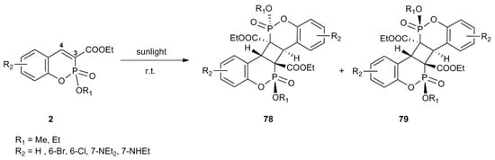 The different chemical behavior of the two isomers 1 and 2 toward [2+2] cycloaddition reactions was illustrated by their ability to form the corresponding dimers [20]. While 1,2-benzoxaphosphorines 2 easily gave the head-to-tail adducts, 3-diethylphosphonocoumarins 1 have shown lack of reactivity in the described transformation. This observation was due to the more aromatic characteristic of the C3=C4 double bond in the lactone ring of the phosphonocoumarin moiety.
